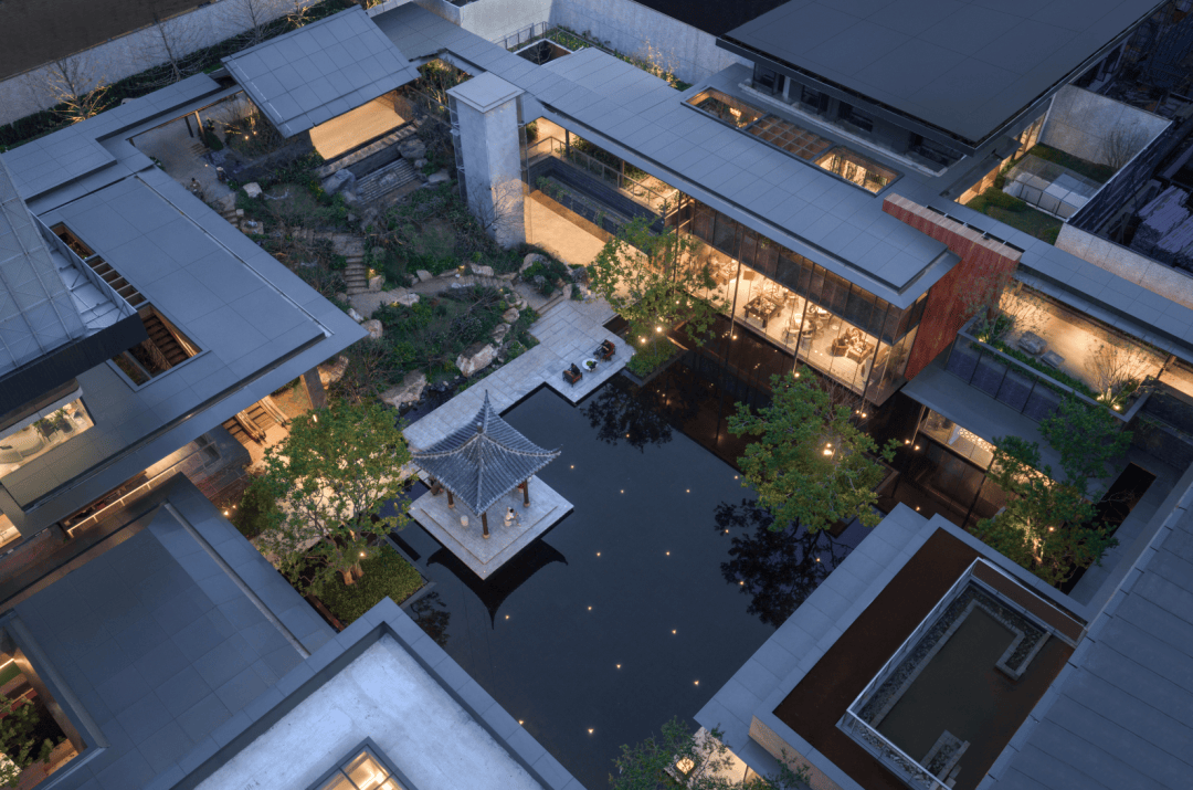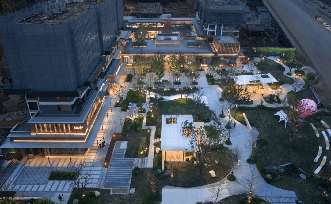而社区的各类功能配套还环绕水景围合结构,他们之间通过半围合开敞长廊,构成通而不透、移步奇不雅的中式园林空间体验。为卑沉原始地貌,取巧的操纵天井取住区之间的约6米高差,构架出了东湖的梅岭之态,塑制出双首层立体空间条理。